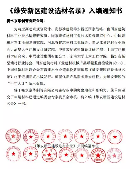 衡水京华制管 入编《雄安新区建设选材名录》